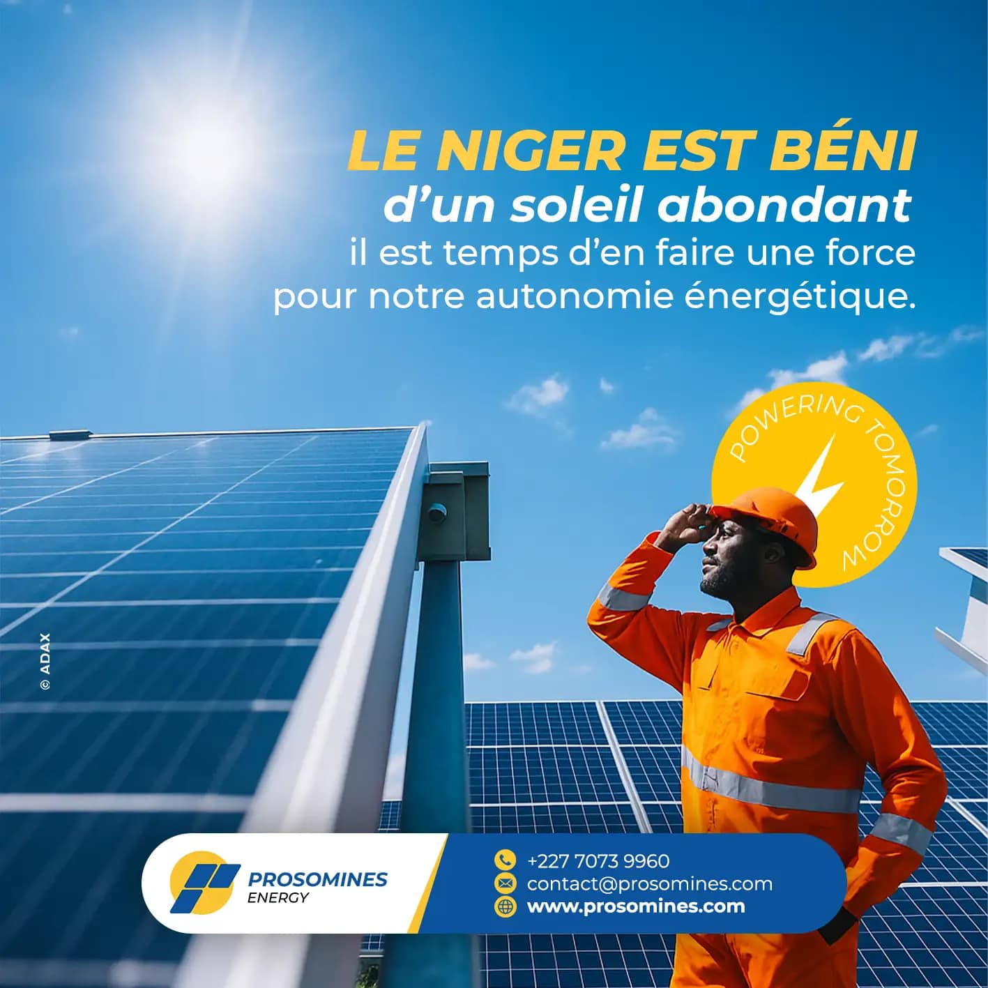 Dans un contexte où l’énergie solaire reste encore peu comprise et sous-exploitée au Niger, Prosomines devait expliquer, rassurer et convaincre. L’enjeu était de rendre ce secteur accessible au grand public à travers des visuels capables de vulgariser les usages, les bénéfices et l’impact réel des solutions solaires.